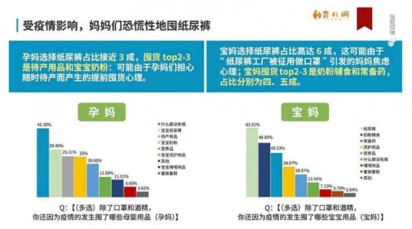 疫情期間,“少出門,多囤貨”成為大多數(shù)人的心理寫照。除口罩、消殺類產(chǎn)品外,母嬰人囤貨的重點(diǎn)還是在奶粉、紙尿褲等寶寶生活必須品上。育兒網(wǎng)發(fā)布的《“新冠肺炎”疫情下的母嬰生活現(xiàn)狀報(bào)告》顯示,孕媽囤貨的top3分別是紙尿褲、待產(chǎn)用品和寶寶奶粉。寶媽囤積紙尿褲的力度更大,有超過60%的媽媽在疫情期間囤紙尿褲,奶粉輔食和常備藥也是他們囤貨的重點(diǎn)。