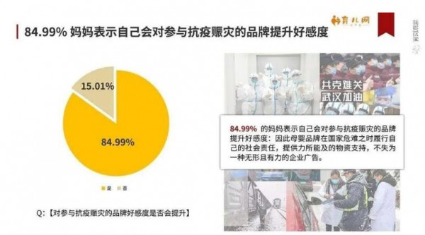 《報(bào)告》還顯示,84.99%的媽媽表示自己會(huì)對(duì)參與抗疫賑災(zāi)的品牌提升好感度。無論是緊急轉(zhuǎn)產(chǎn)口罩,還是疫情發(fā)生后第一時(shí)間組織捐款捐物,紙尿褲行業(yè)很多企業(yè)都在疫情期間展現(xiàn)出擔(dān)當(dāng)和責(zé)任。除了口罩、洗手液、消毒液等基礎(chǔ)防疫物資,很多紙尿褲企業(yè)向武漢等疫情重災(zāi)區(qū)捐出大量成人紙尿褲,解決了一線醫(yī)護(hù)人員的生理問題。