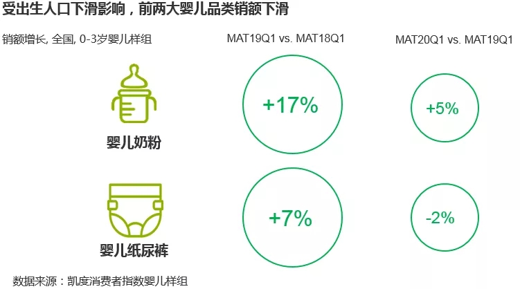 受到新生人口減少的影響,母嬰市場兩大頭部品類——奶粉和紙尿褲增長開始放緩。凱度消費者指數(shù)顯示,2019年一季度嬰兒紙尿褲銷售額同比增長7%,但2020年一季度同比下滑了2%,這一部分下跌與年初的疫情事實上關系不大。多位資深從業(yè)者表示,即便身處動蕩的疫情環(huán)境下,消費者對于奶粉、紙尿褲這樣的剛需產(chǎn)品的投入絲毫不會吝嗇。