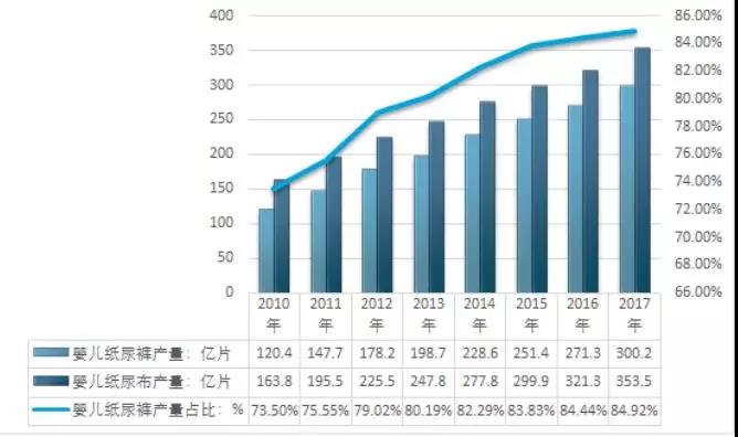 (2010-2017年中國(guó)嬰兒紙尿褲產(chǎn)量及占比情況)