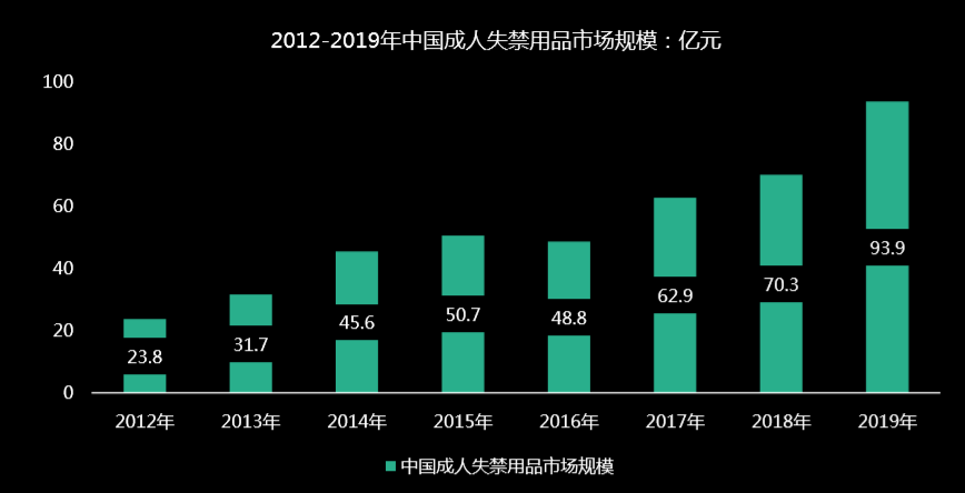 根據(jù)人口失禁發(fā)生率和人口結(jié)構(gòu)估算,中國失禁的人數(shù)在2-3億人,按照每人正常使用片單數(shù)去核算,這個群體的失禁用品規(guī)模應(yīng)該是現(xiàn)在實際的4-5倍(2019年中國成人失禁用品市場規(guī)模為93.9億元),這還是保守估算的結(jié)果。
