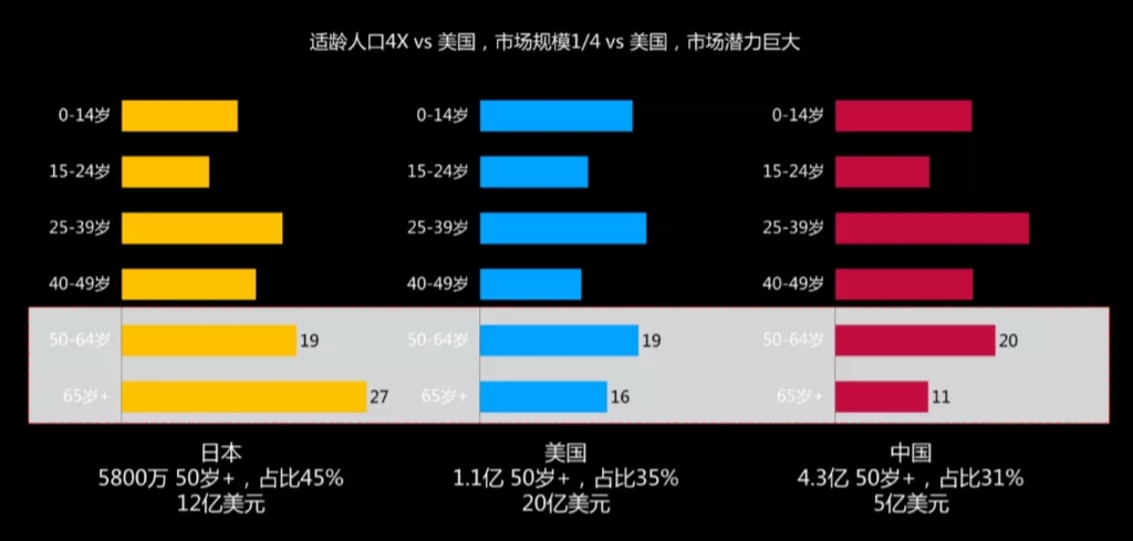 舉個例子,2017年中國50+人口是4.3億人,是美國同年50+人口的4倍(美國為1.1億),但是2017年中國中老年護理行業(yè)市場規(guī)模為5億美元,美國為20億美元。中國還有多大的市場潛力沒有釋放出來?