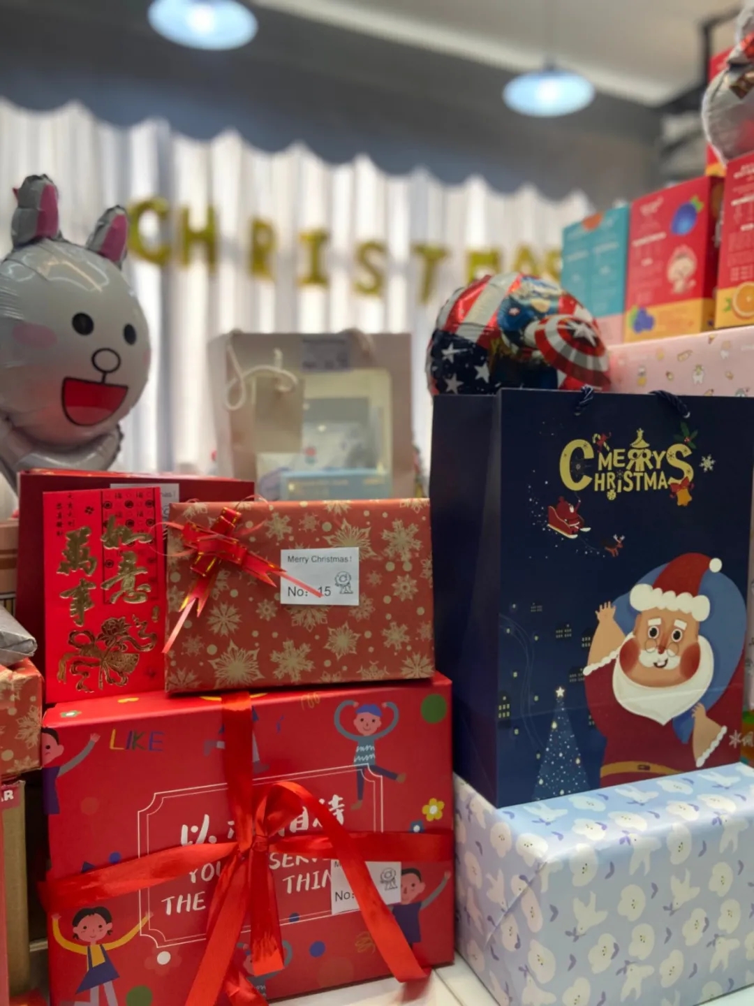喏,臺上滿滿當(dāng)當(dāng)?shù)木拢蟮男〉?,紅的綠的,還有會發(fā)光的,禮應(yīng)如此!
