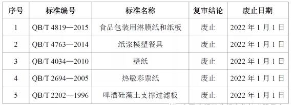 工業(yè)和信息化部2020年12月31日發(fā)布公告(中華人民共和國工業(yè)和信息化部公告2020年第51號),公告了一批行業(yè)標(biāo)準(zhǔn)的復(fù)審結(jié)論。其中,QB/T 4819—2015《食品包裝用淋膜紙和紙板》等五項造紙行業(yè)標(biāo)準(zhǔn)予以廢止,廢止日期均為2022年1月1日。具體情況如下: