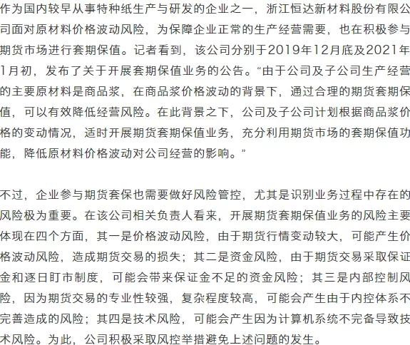 “為了規(guī)避突發(fā)事件對(duì)紙漿需求的影響,國(guó)貿(mào)紙業(yè)在去年1月份通過賣出套保鎖定了在手貨物的預(yù)期利潤(rùn)。同樣的,在4月份國(guó)外疫情開始暴發(fā)的時(shí)候,出于對(duì)后市海外需求銳減的考慮,國(guó)貿(mào)紙業(yè)也及時(shí)通過套期保值對(duì)沖了在途貨物的價(jià)格風(fēng)險(xiǎn)。”