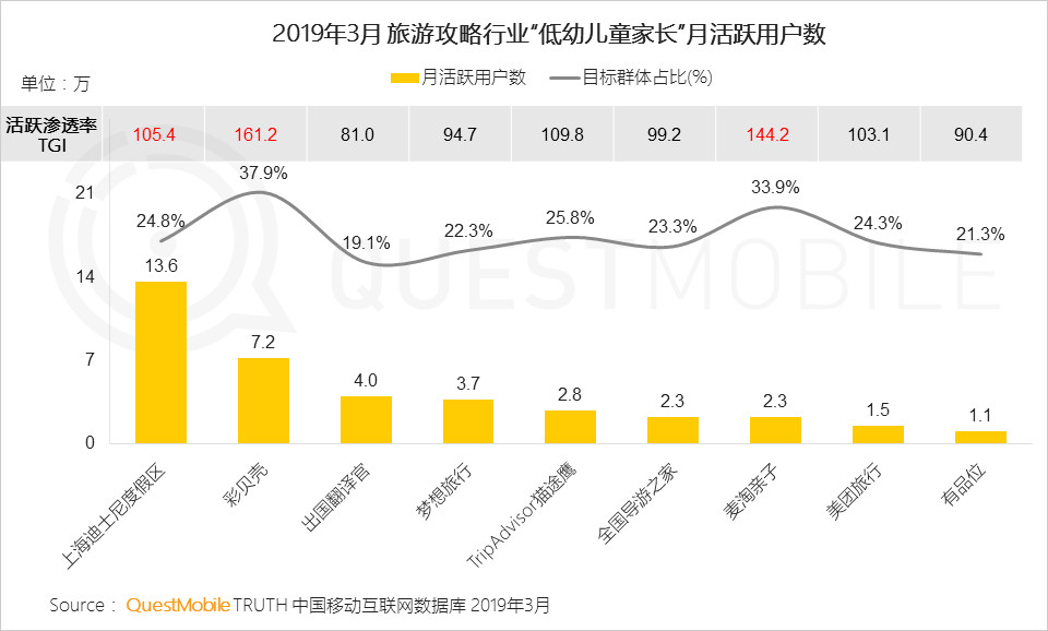 在親子旅游方面,隨著親子節(jié)目的熱播,讓近兩年親子游市場(chǎng)持續(xù)火爆。在旅游攻略APP中,彩貝殼目標(biāo)群體占比37.9%,其次為麥淘親子33.9%,而麥淘親子、上海迪士尼、彩貝殼等親子游類的旅游攻略受到低幼家長(zhǎng)的青睞。從中可以看到隨著對(duì)教育要求的全面升級(jí),孩子的眼界和經(jīng)歷、親子陪伴也成為了父母關(guān)注的一大重點(diǎn)。