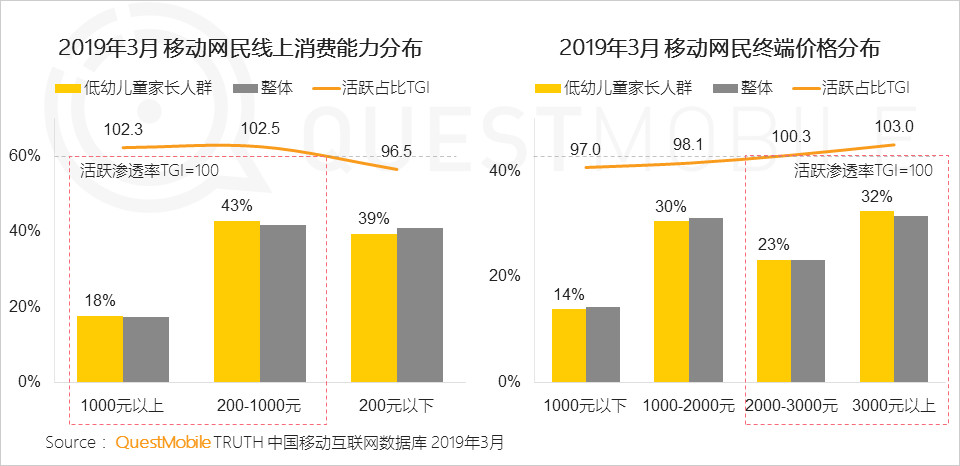 2019年3月移動(dòng)網(wǎng)民線上消費(fèi)能力數(shù)據(jù)顯示,200-1000元線上消費(fèi)占比43%,1000元以上18%,200元以下39%。但網(wǎng)民終端價(jià)格3000元以上占32%,2000-3000元占23%。從中可以看到“低幼兒童家長(zhǎng)”人群線上消費(fèi)能力顯著高于整體網(wǎng)民,且使用高價(jià)格終端的比例較高,未來(lái)兒童消費(fèi)將成為經(jīng)濟(jì)市場(chǎng)一大增長(zhǎng)點(diǎn)。