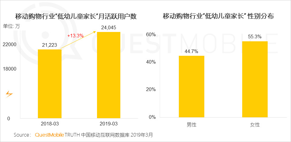 在線消費(fèi)領(lǐng)域,2019年3月網(wǎng)購(gòu)的“低幼兒童家長(zhǎng)”人群同比增長(zhǎng)13.3%;其中移動(dòng)購(gòu)物行業(yè)”低幼兒童家長(zhǎng)“性別分布上來(lái)看,男性占44.7%,女性占到55.3%??梢姷?ldquo;寶媽”者得市場(chǎng),女性的占比顯著高于男性。