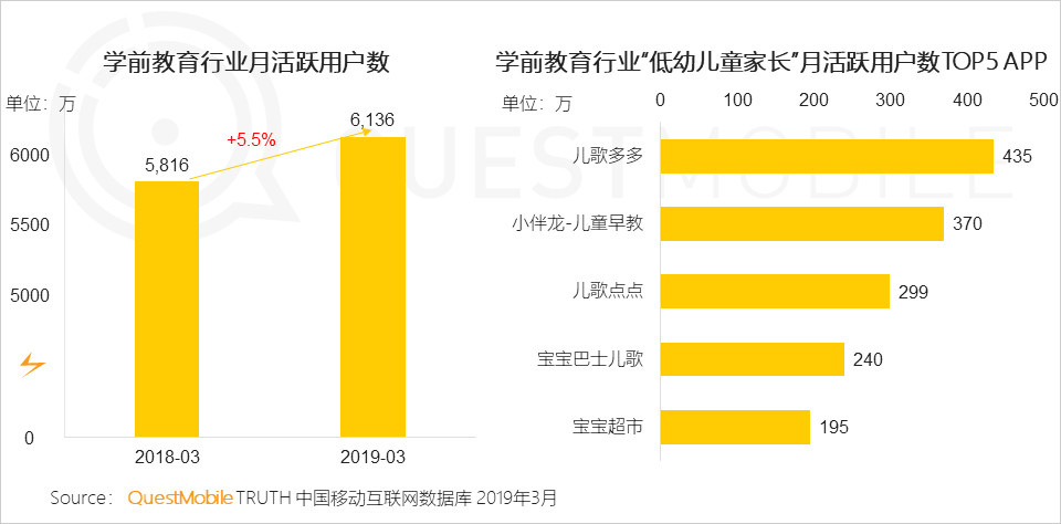 最新數(shù)據(jù)顯示,學(xué)前教育用戶增速明顯高于整體移動(dòng)網(wǎng)民增長(zhǎng)速度,而在線早教憑借技術(shù)的快速發(fā)展深得家長(zhǎng)喜愛,在學(xué)前教育行業(yè)”低幼兒童家長(zhǎng)“月活躍用戶數(shù)TOP5APP排列依次分別是兒歌多多、小伴龍-兒童早教、兒歌點(diǎn)點(diǎn)、寶寶巴士?jī)焊?、寶寶超市。其中早教APP兒歌多多以435萬(wàn)排列第一,其次為小伴龍-兒童早教月活躍用戶達(dá)370萬(wàn)。