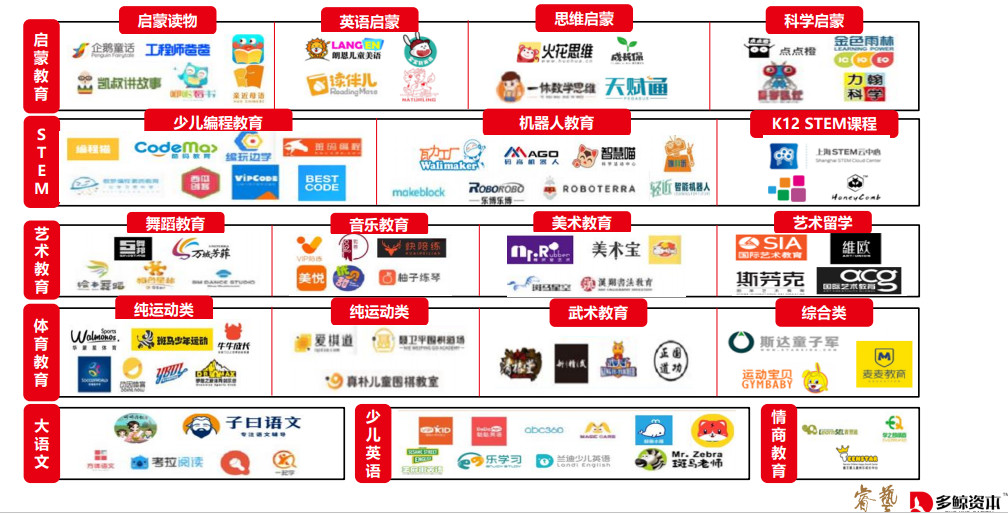 從素質(zhì)教育細(xì)分賽道典型公司來(lái)看,產(chǎn)品類型覆蓋啟蒙教育、藝術(shù)教育、早幼教平臺(tái)、少兒編程教育、情商教育等。