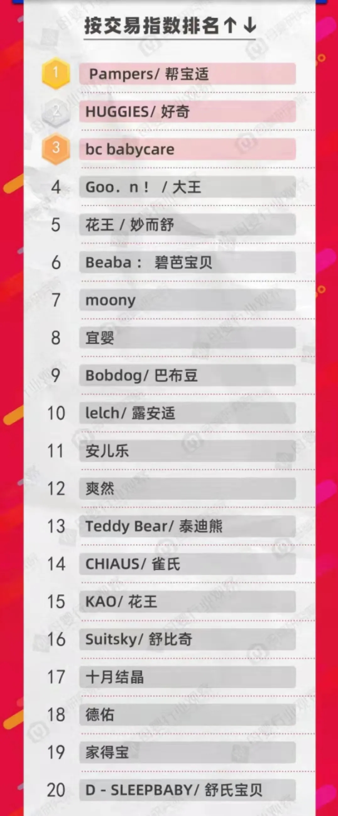 以上榜單是截止到今天早上9點(diǎn),雙十一紙尿褲終極排名榜單晚上12點(diǎn)才會揭曉,最終榜單如何,大家拭目以待吧!