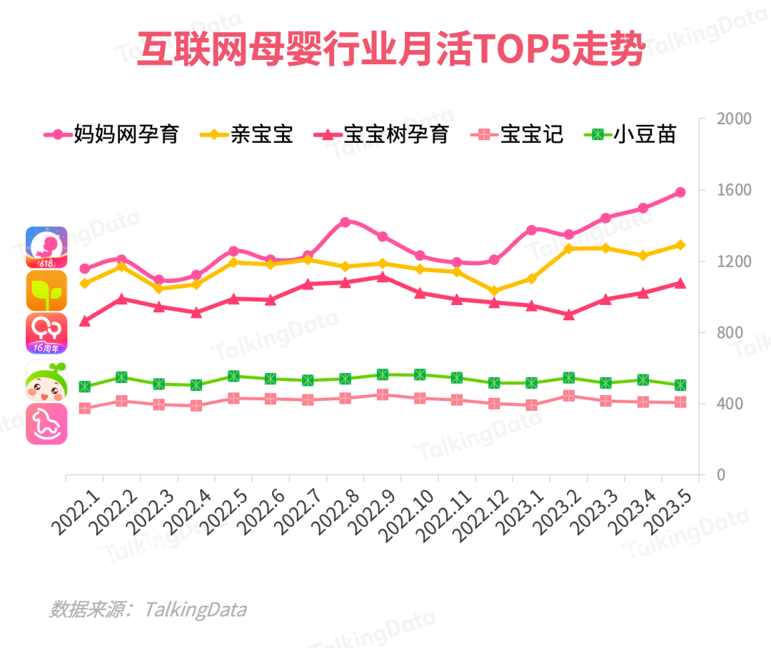 在行業(yè)Top 5平臺的2023年1-5月月活趨勢上,媽媽網(wǎng)孕育、親寶寶、寶寶樹孕育均表現(xiàn)出不同程度的增速??赡艿靡嬗谄淠笅胗脩羧后w的忠誠度和能提供有價(jià)值的版塊/內(nèi)容,媽媽網(wǎng)孕育體現(xiàn)出更為顯著的優(yōu)勢。