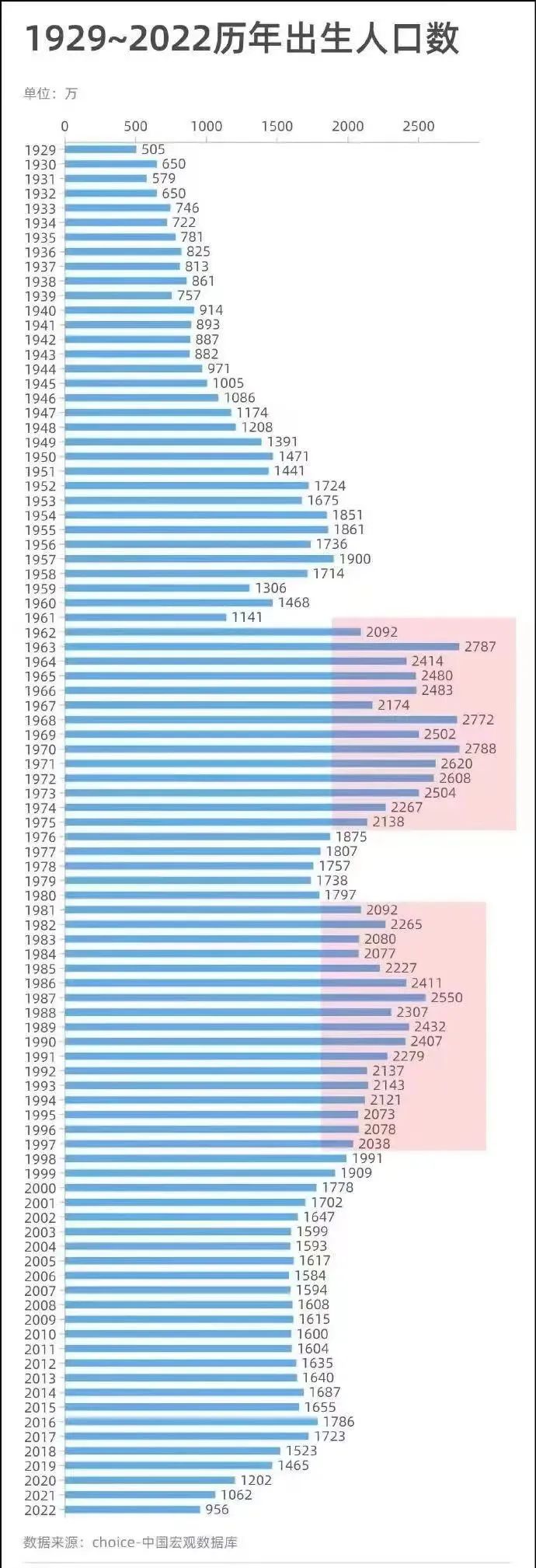 中國(guó)歷年出生人口變化(1929-2022):1970年最高2788萬(wàn),2022年全國(guó)人口出生僅為956萬(wàn),創(chuàng)下了有數(shù)據(jù)記錄以來的歷史新低。下圖是1929-2022年人口出生數(shù):