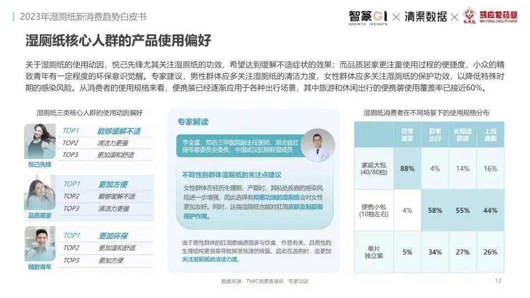 淘系濕廁紙品類近三年的消費金額持續(xù)增長,增幅遠超衛(wèi)生用紙整體市場,其中,天貓官旗的消費責獻占主陣地,MAT2023占淘系年度消費的六成以上,市場規(guī)模的擴張主要來自消費人數(shù)的增長,有越來越多的新客涌入,共同推動溫廁紙的全民風潮,同時,消費者的使用習慣養(yǎng)成,復購意愿顯現(xiàn),消費頻次也達到衛(wèi)生用紙整體的增速。