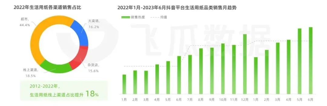 不可否認(rèn),從現(xiàn)階段分渠道來(lái)看,線下商超仍是人們購(gòu)買(mǎi)生活用紙的首要渠道,22年銷售占比超過(guò)44%。