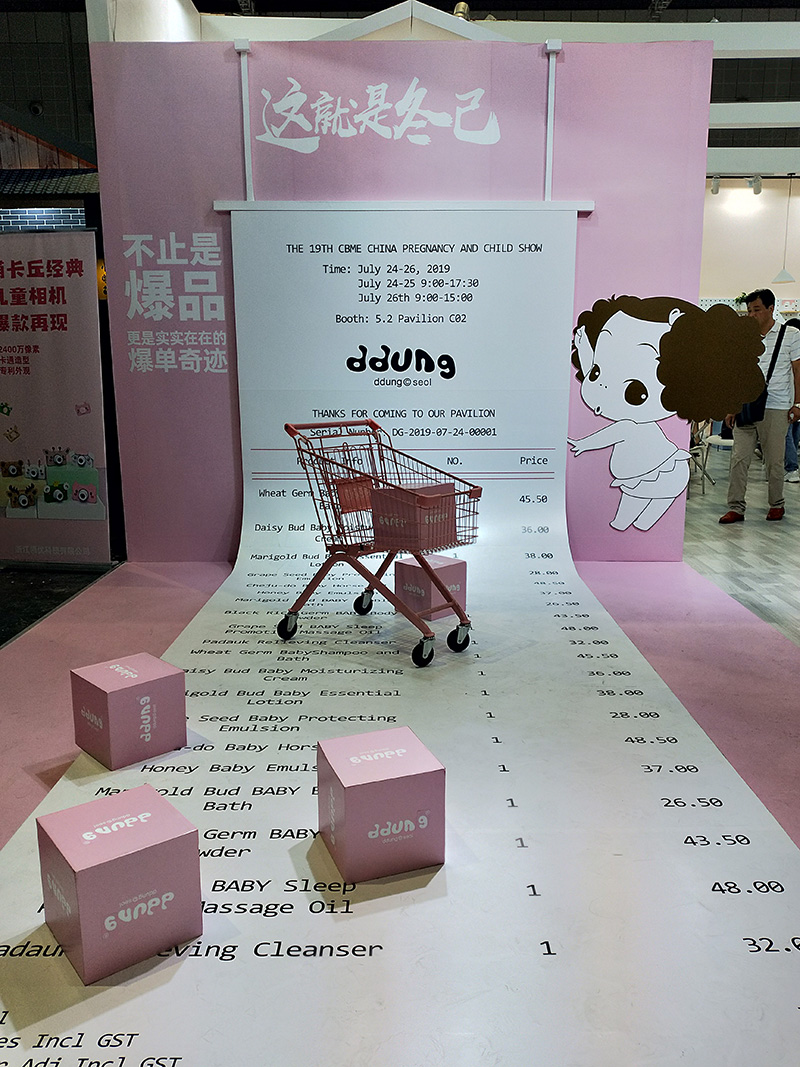 冬己展位結(jié)合卡通IP做出購物車和賬單的場(chǎng)景,巧妙地利用場(chǎng)地空間制造立體視覺,頗具想象力的設(shè)計(jì)實(shí)現(xiàn)有效地引流。